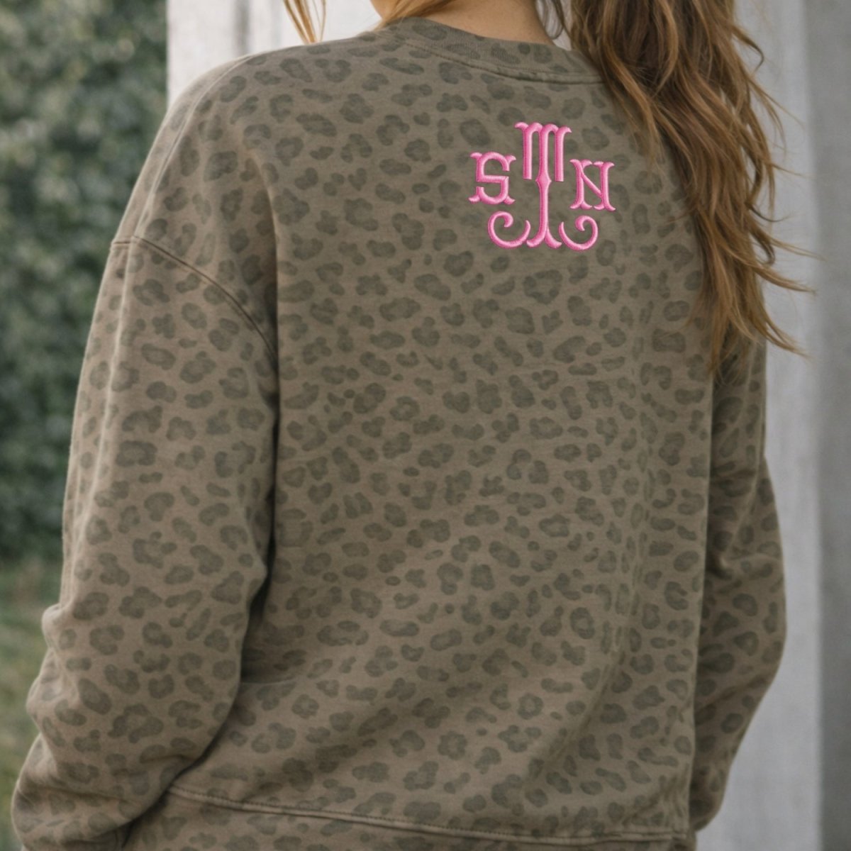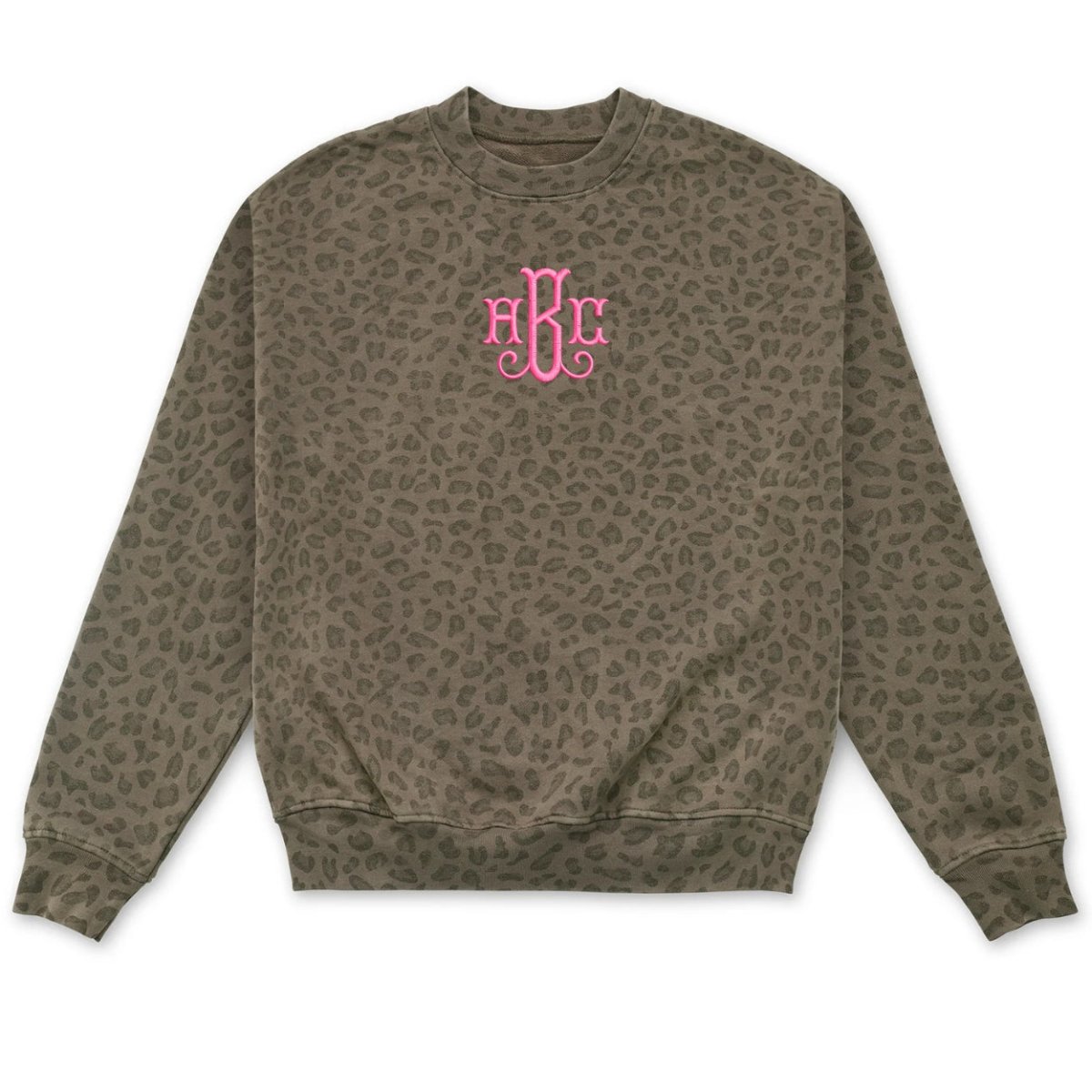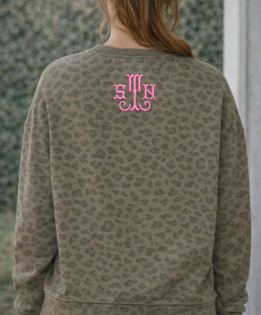 The Monogrammed Vintage Leopard Crew features an all-over soft leopard print with your custom 3-letter monogram stitched exactly how you choose. Whether you go classic white or bold pink, this piece blends timeless personalization with that effortless, cozy vibe.