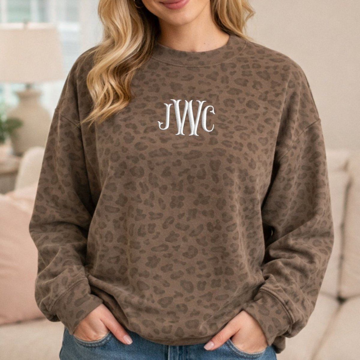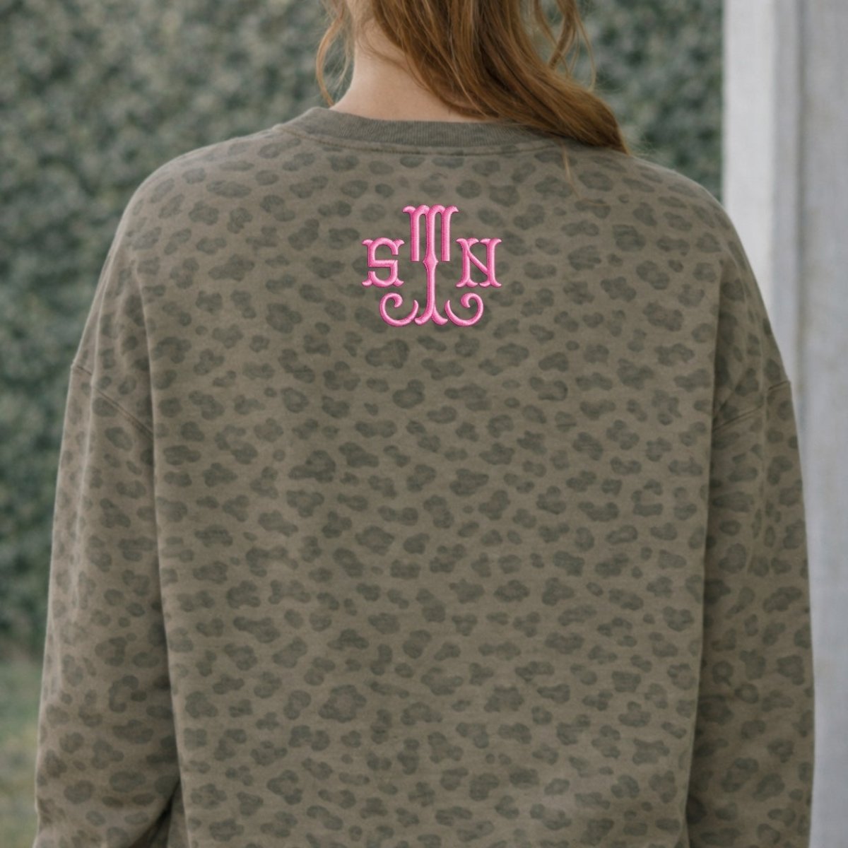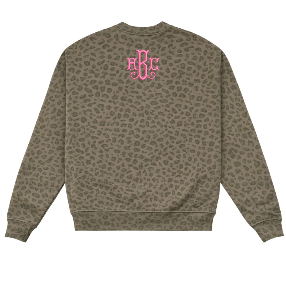The Monogrammed Vintage Leopard Crew features an all-over soft leopard print with your custom 3-letter monogram stitched exactly how you choose. Whether you go classic white or bold pink, this piece blends timeless personalization with that effortless, cozy vibe.