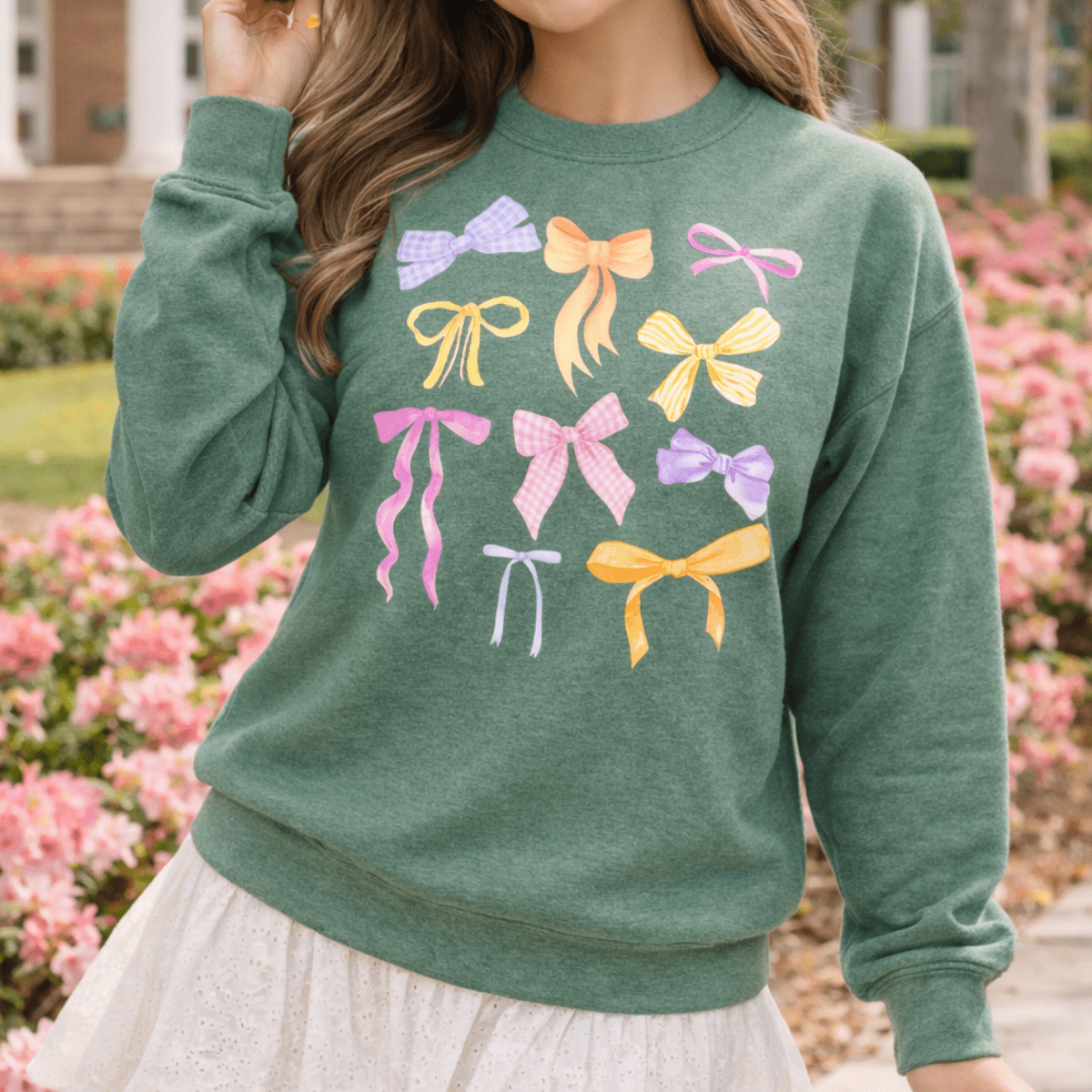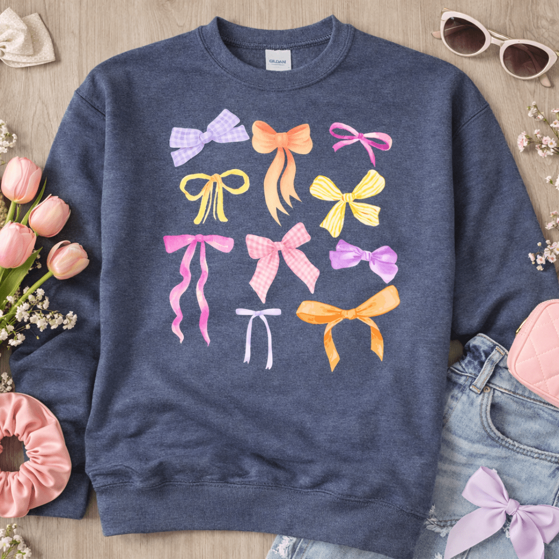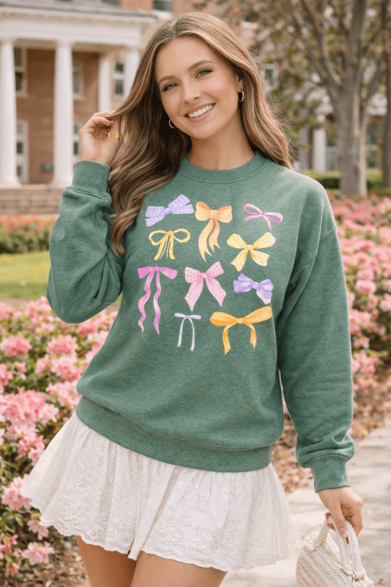 The ‘Spring Bow Show’ Heather Crewneck features a playful mix of watercolor-style bows in soft pastels that instantly elevate your everyday look. Feminine, fresh, and eye-catching, it’s designed to make a simple outfit feel styled without any extra effort.