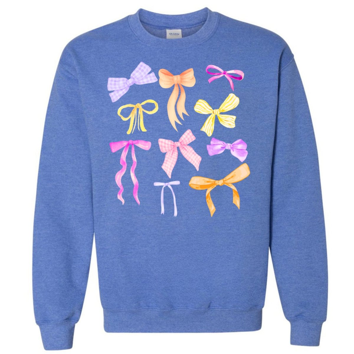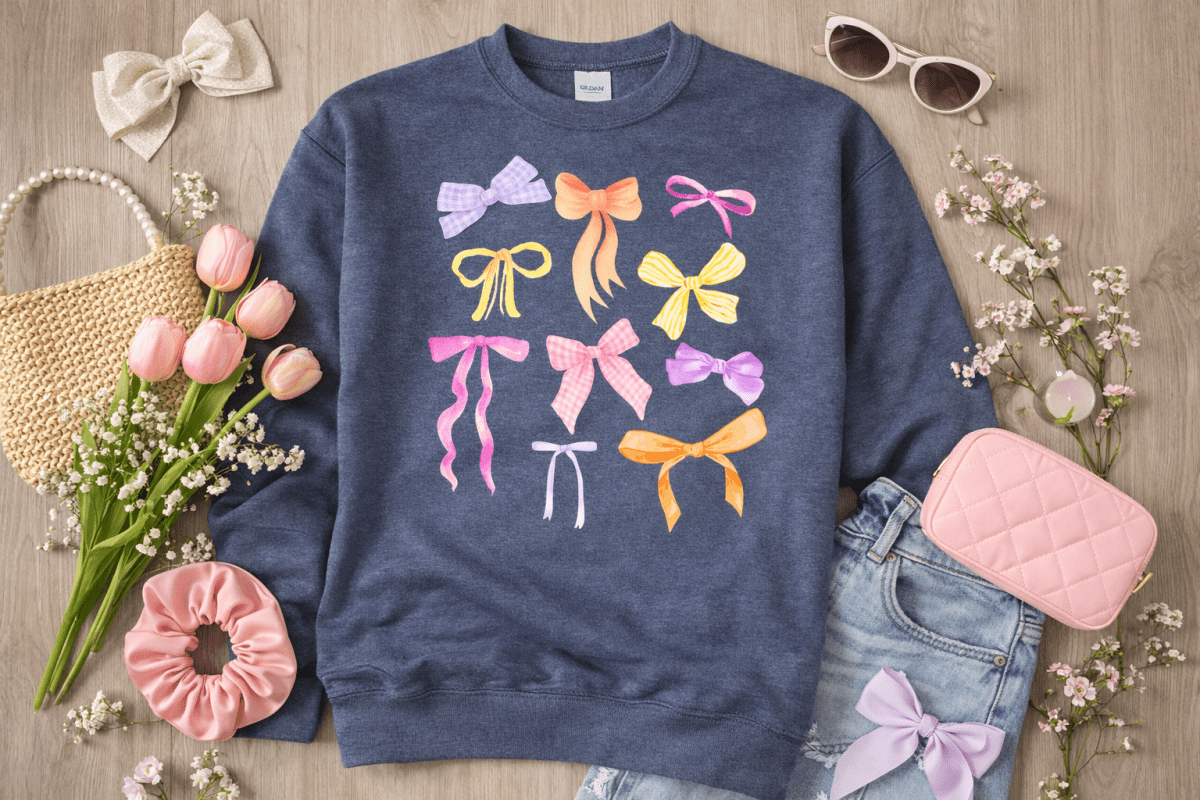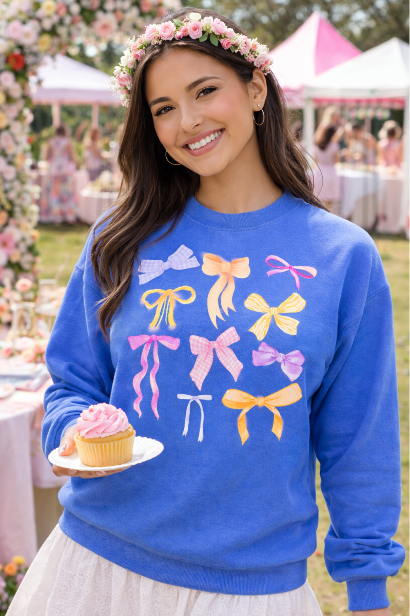 The ‘Spring Bow Show’ Heather Crewneck features a playful mix of watercolor-style bows in soft pastels that instantly elevate your everyday look. Feminine, fresh, and eye-catching, it’s designed to make a simple outfit feel styled without any extra effort.