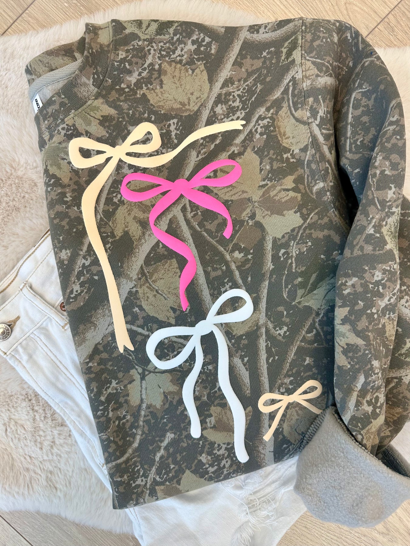 Our PUFF “Bold Bow” Camo Hideaway Crewneck blends cozy comfort with bold, girly details for a look that stands out in the best way.