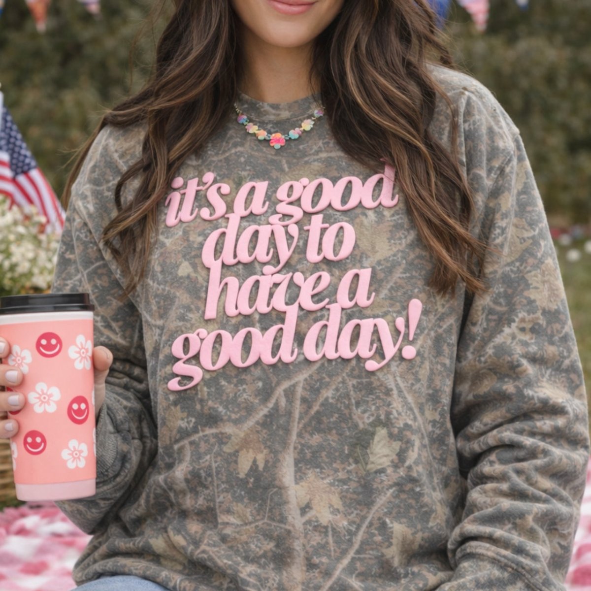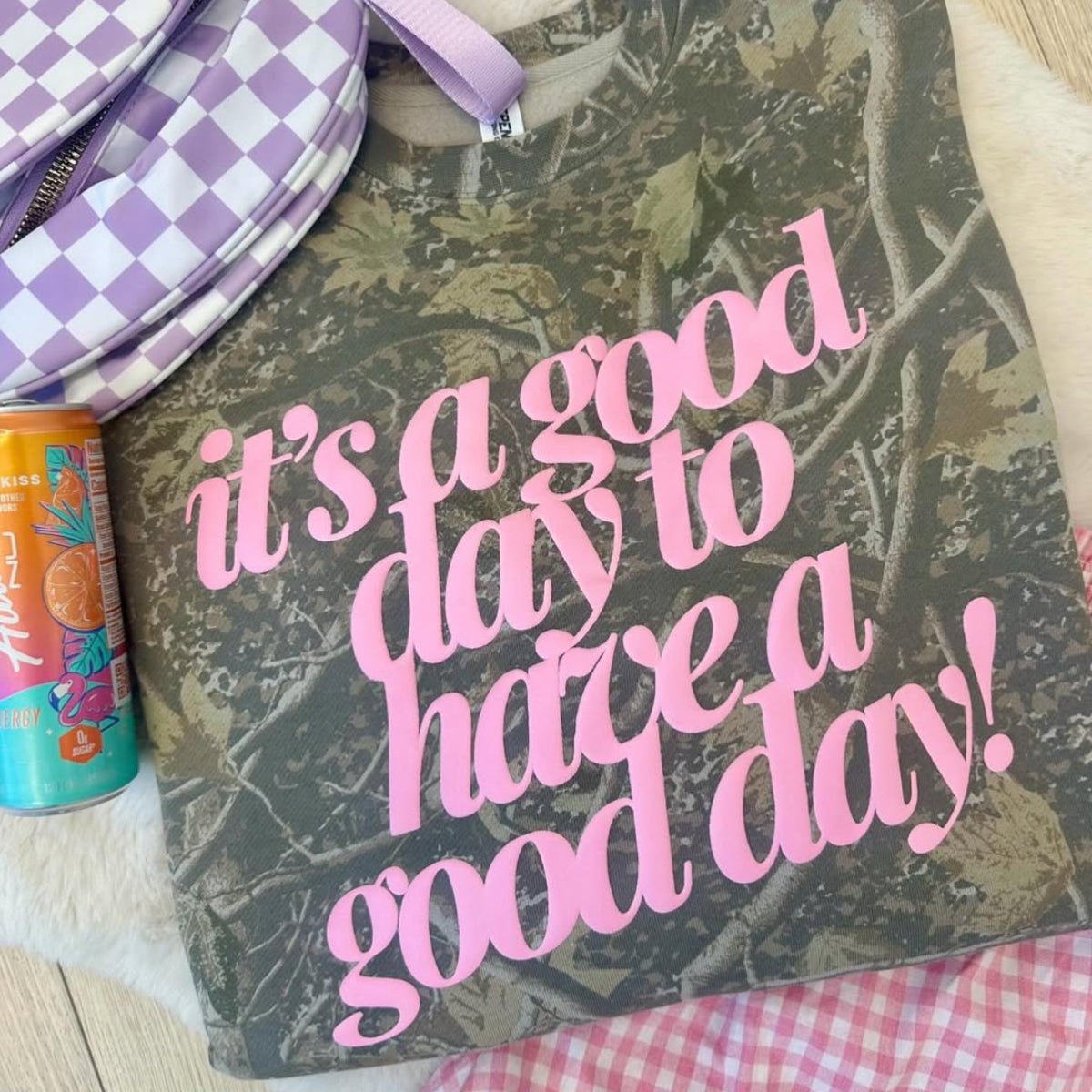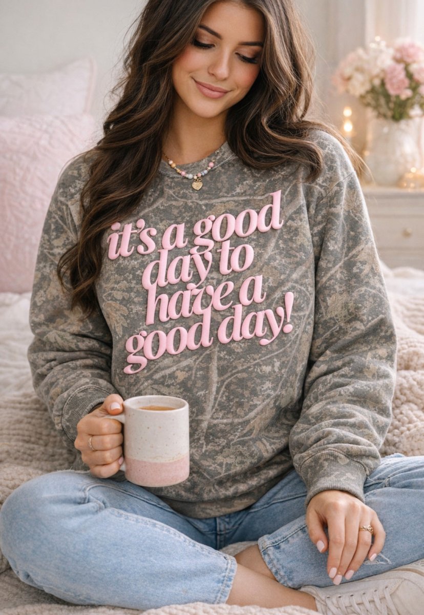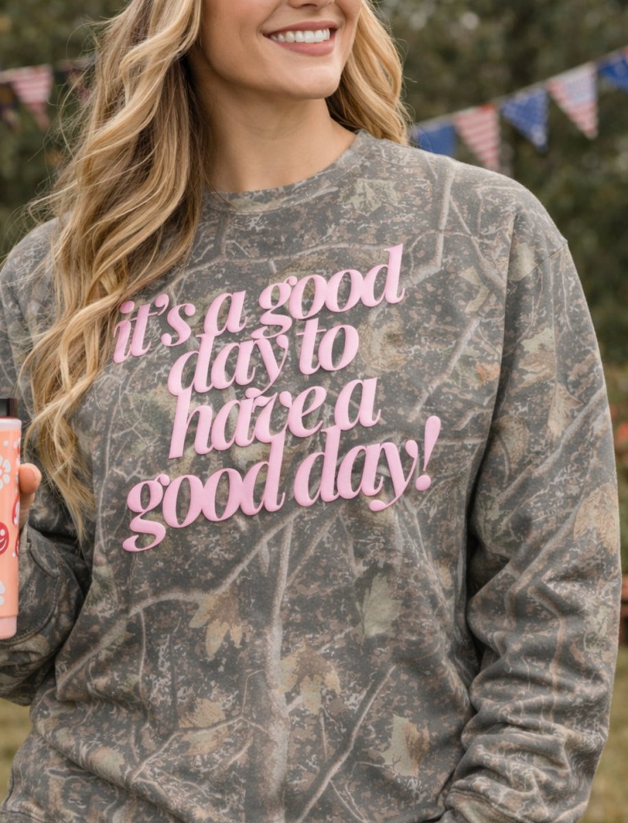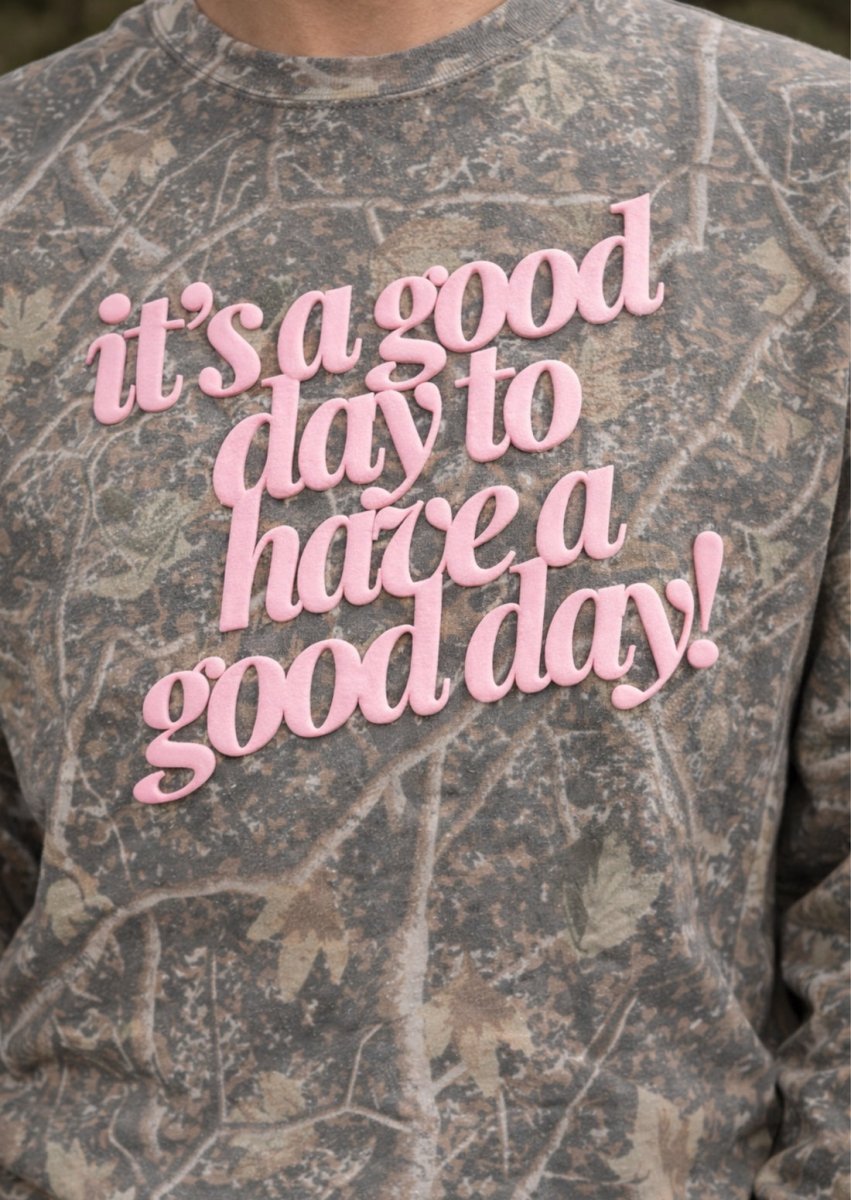 The PUFF ‘Good Day²’ Camo Hideaway Crewneck features our signature Realtree-style camo paired with bold pink 3D PUFF lettering that literally pops off the fabric. Cozy, confident, and effortlessly cool, this crewneck is made for slow mornings, coffee runs, errands, and those “I’m comfy but still styled” days.