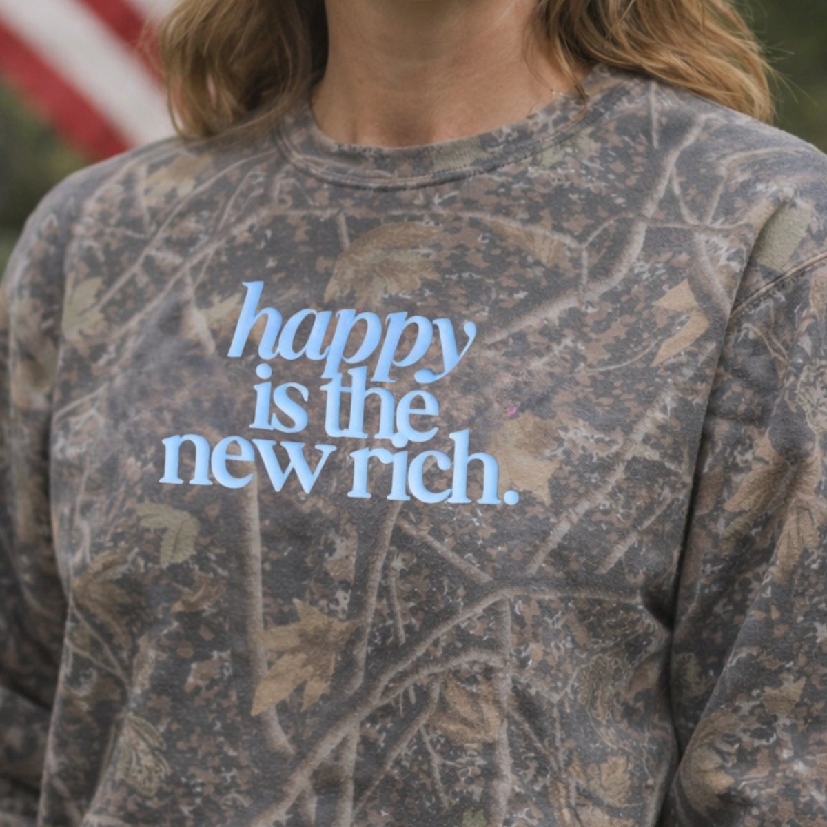 PUFF “Happy is the New Rich” Camo Hideaway Crewneck