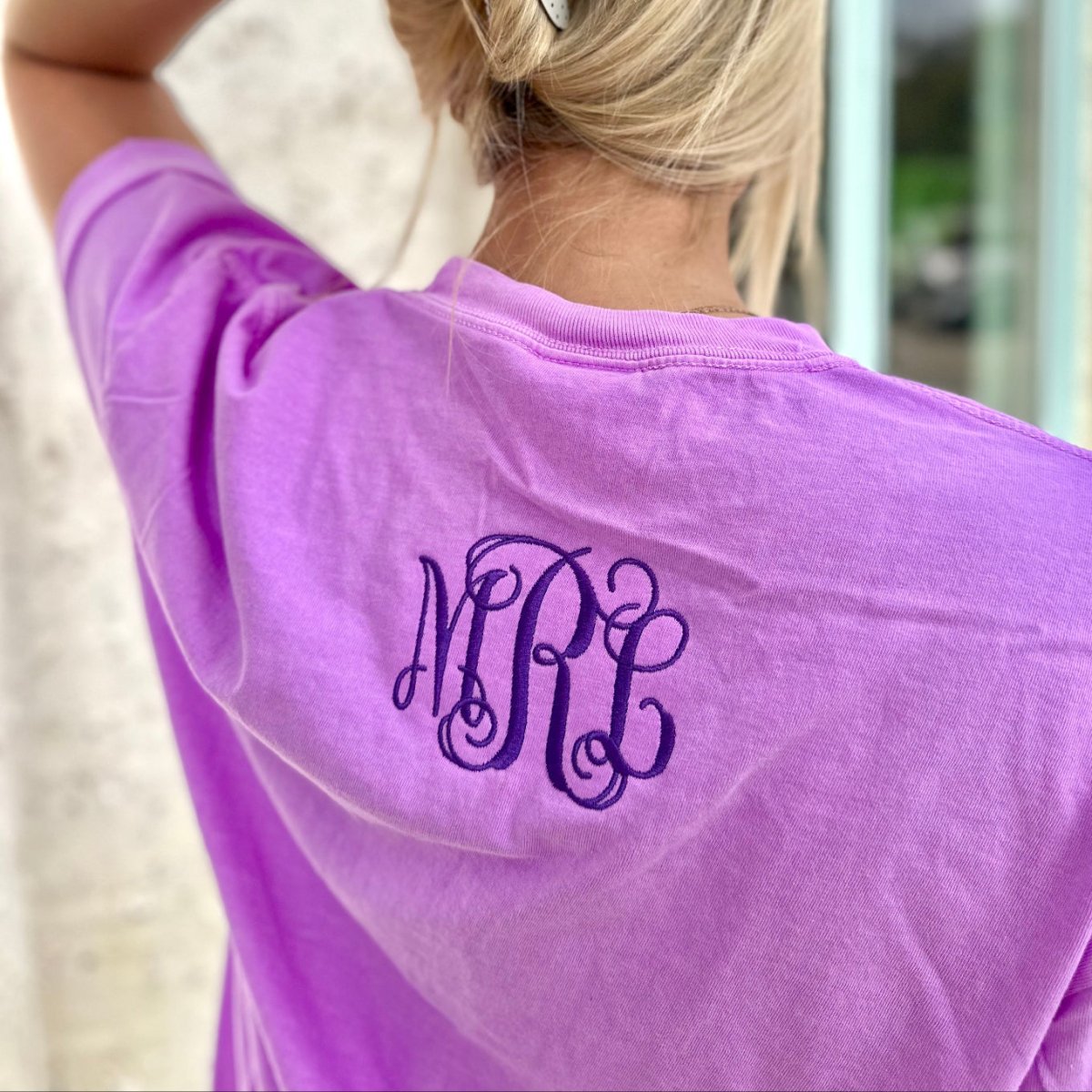 It’s the perfect placement when you want something minimal, polished, and different from the traditional chest monogram. The result is a tee that looks effortlessly put-together from every angle - especially when your hair is up or layered under a sweatshirt.