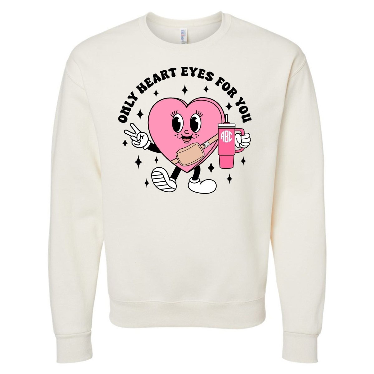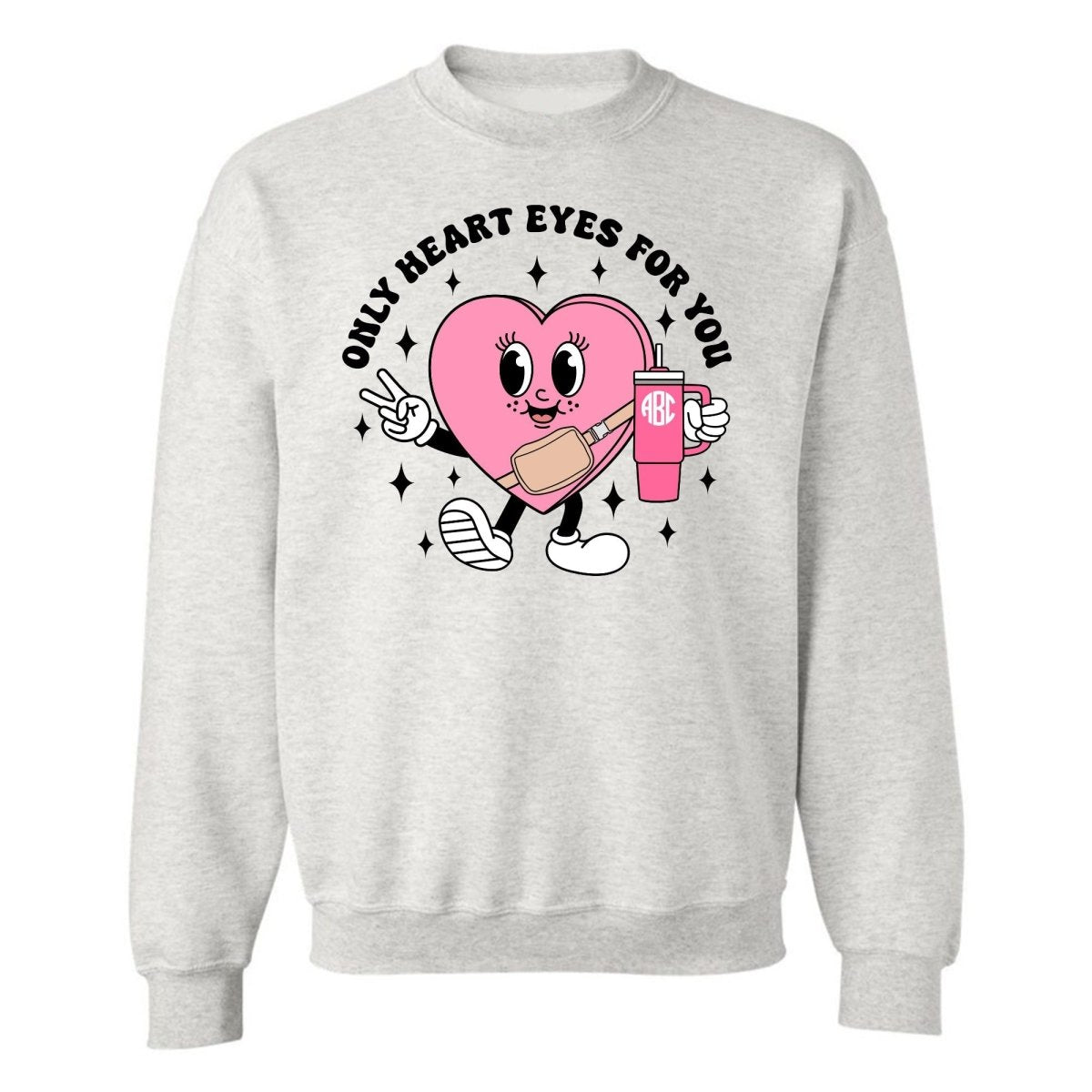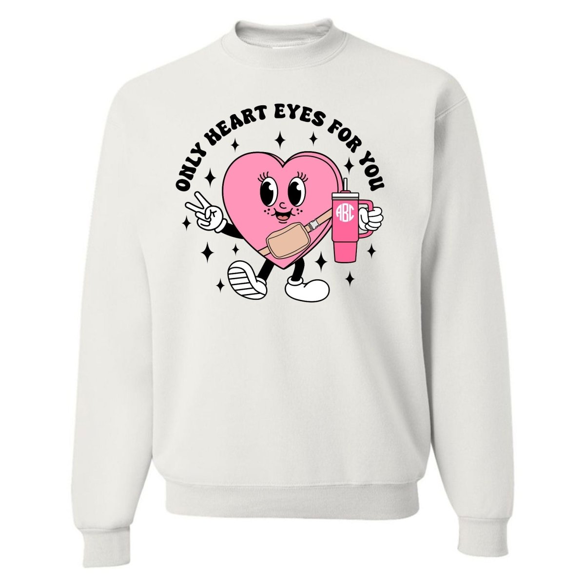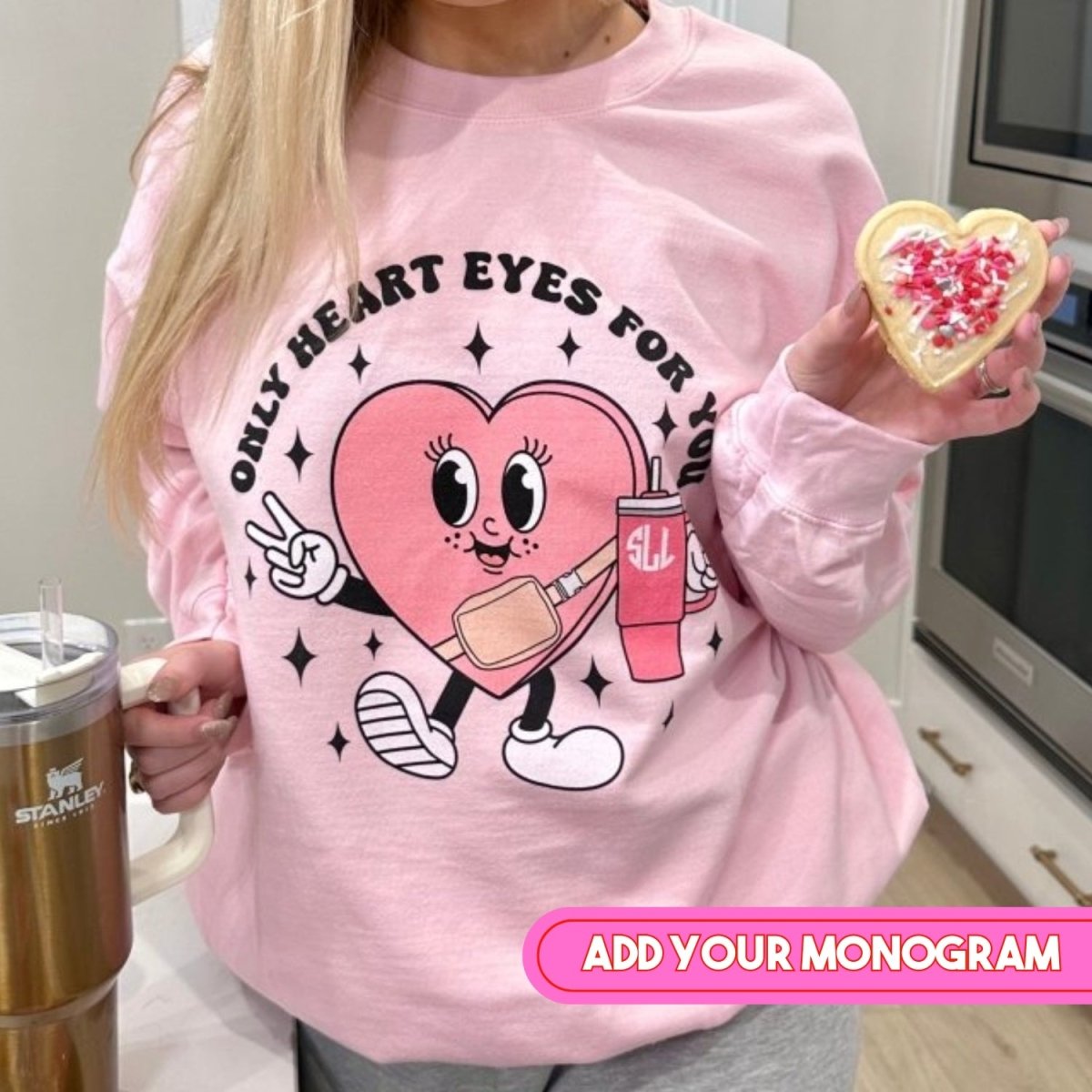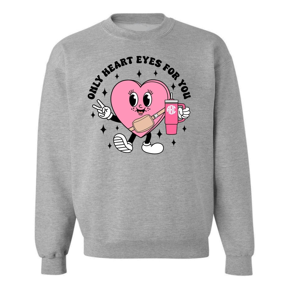 Express your love with the Monogrammed 'Only Heart Eyes For You' Sweatshirt. Personalized with your monogram and a message of devotion, this cozy crewneck is perfect for showing your affection.