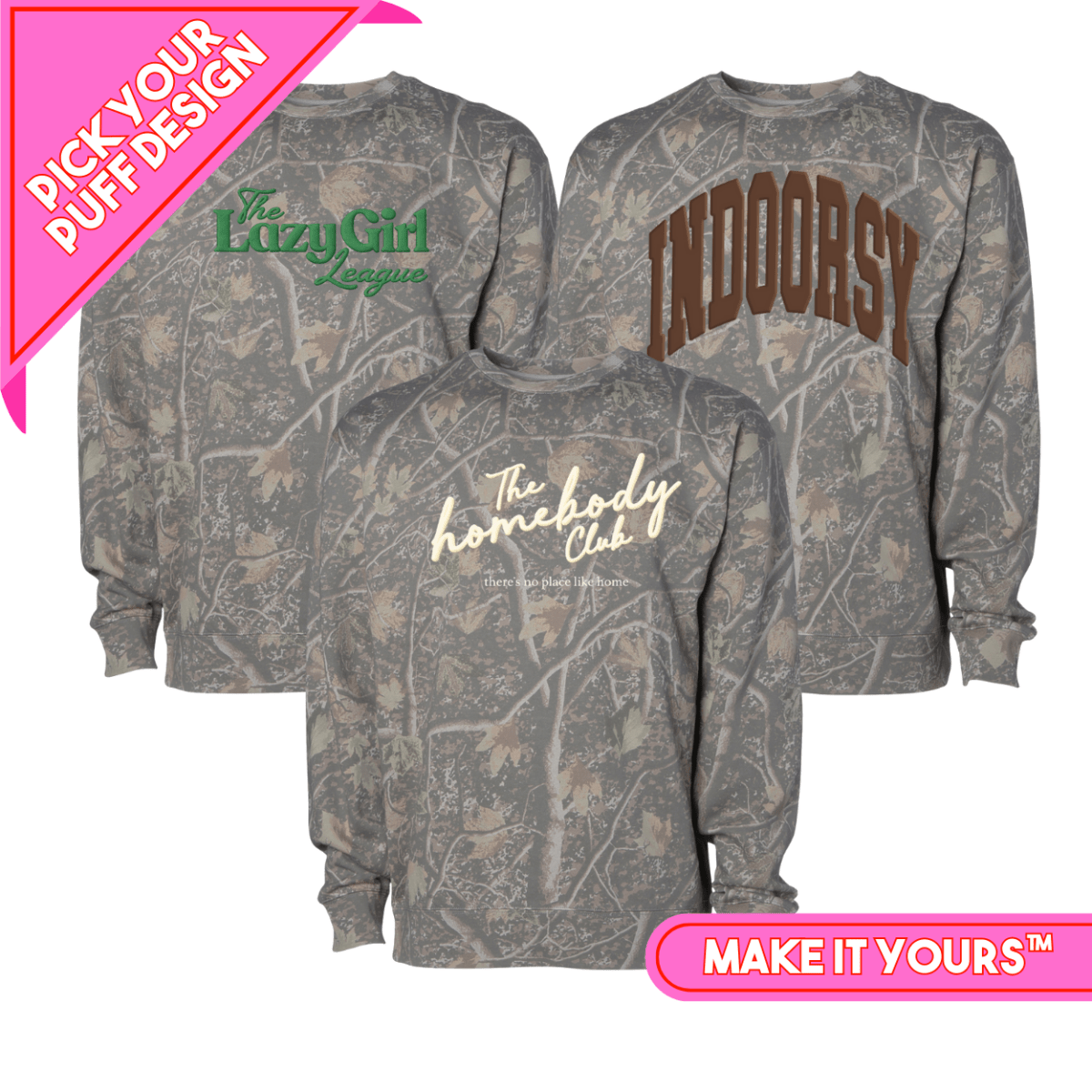 Made on our new Hideaway Camo Crew, this sweatshirt features bold, raised PUFF designs like Homebody Club, Lazy Girl League, and more. Each puff style adds soft texture and dimension, giving this crew an elevated, feel-good look you’ll want to live in.