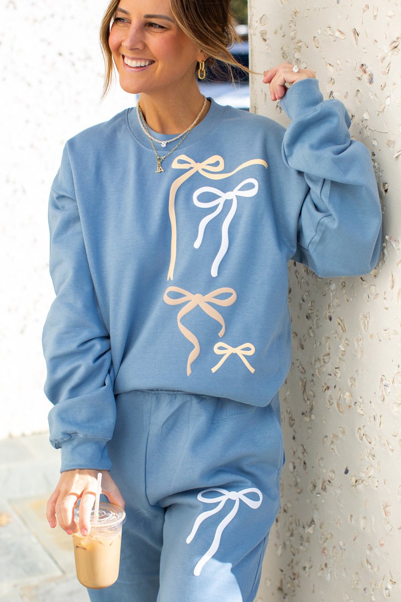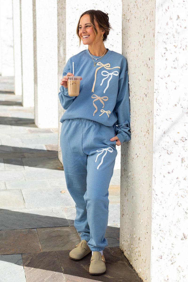 This matching sweatshirt and jogger set features a raised PUFF print bow design, giving it that extra texture and boutique detail you’ll love. The stacked bow artwork adds a playful yet minimal vibe that feels effortlessly chic.